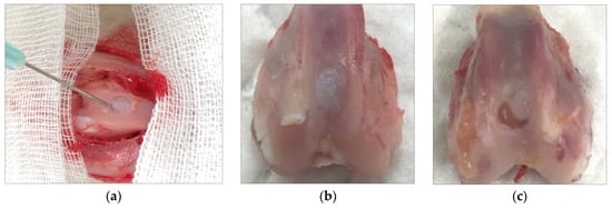 (a) Injection of atelocollagen mixed with fibrin into the trochlear defect of a rabbit knee. (b) Atelocollagen injection group after 12 weeks. (c) Control group without injection after 12 weeks.