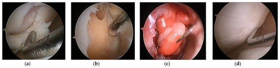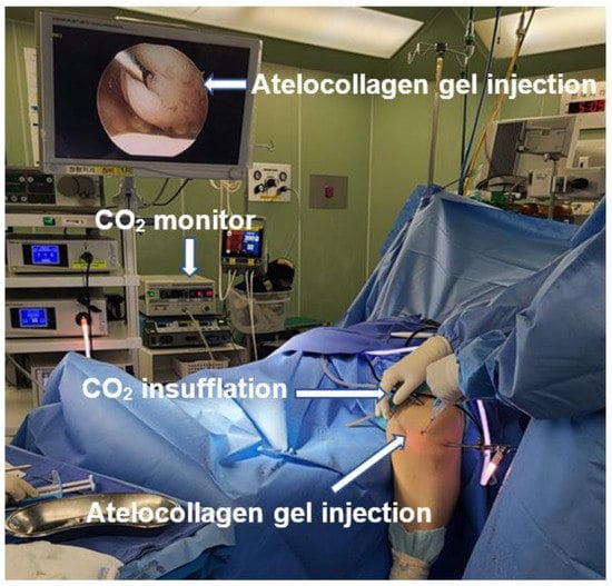 ACIC is performed in the same manner as routine knee arthroscopy (Figure 9). The articular cartilage is evaluated and mapped according to ICRS guidelines. The lesion is debrided until the margins show stable vertical cartilage. The surface is lightly abraded with a curette or burr to debride sclerotic subchondral bone. Microdrilling is performed, and the subchondral bone is drilled with a 3.5 mm diameter bit up to a depth of 6–10 mm, with a 3 mm interval. After that, the arthroscopic water of the knee joint is drained, and the joint is insufflated with CO2 (Figure 9). The surface of the subchondral bone is dried with cotton to promote adhesion by the collagen mixture. Atelocollagen gel mixed with fibrinogen and thrombin (ratio—fibrin 1: thrombin 0.2 and atelocollagen 0.8) is prepared and applied under arthroscopy. The applied mixture is assessed for stability in the cartilage defect by observing the range of motion of the knee after 2 min [,] (Figure 10).