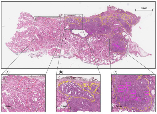 Figure 2. Whole-slide image (WSI) annotation: (a) normal regions, (b) tumor regions, and (c) TERT ROIs are marked in red and yellow contours and purple bounding boxes, respectively.
