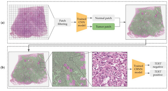 Figure 3. Overview of the TERT prediction architecture consisting of (a) a tumor classifier and (b) a mutation predictor.