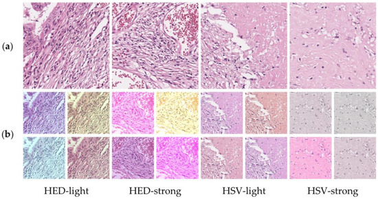 To account for the color diversity of the pathological images, such as those acquired from different scanners or using various staining conditions, color transformations, including hue–saturation–value (HSV) and hematoxylin–eosin–DAB (HED) methods, were applied for a better classification performance [22]. Color-augmentation strategies using HSV/HED-light and HSV/HED-strong have been investigated for tumor classification in Figure 4
