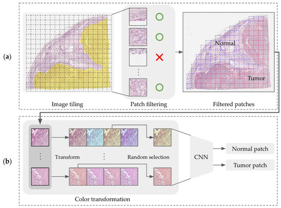 Figure 5. Overview of the CNN training model architecture for tumor area prediction showing (a) image tiling of WSI and patch filtering out from the tiled dataset (the yellow mask represents tumor area annotation, blue dot boxes are normal patches, and red dot boxes are tumor patches) and (b) the color transformation of the filtered patches.