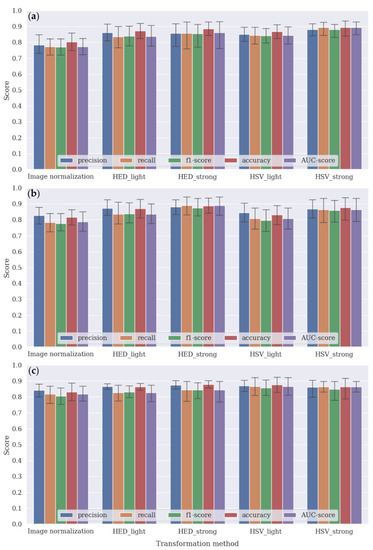 Most bar plots show that the performance scores of the CNN architecture using the color transformation methods were better than those using image normalization, resulting in an improvement of approximately >6% (±2%) in terms of both accuracy and AUC score. The figures show that DenseNet161, VGG16, and EfficientNet_b4 had the best performance results with HSV-strong, HED-strong, and HSV-light transformation methods, respectively. More detailed results are provided in Supplementary Materials Table S2.