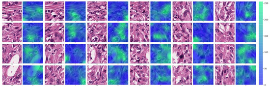To examine the areas highlighted by the CRNN model in the tumor patches predicted to be TERT positive, we created attention maps for the CNN modules on the basis of the score values extracted from the last fully connected layers. Because the TERT ROI has 24 patch images, each attention map is displayed in Figure 8, where the deeper the green color, the higher the attention score. In general, tumor cells showing size enlargement and nuclear hyperchromasia with prominent nucleoli, which are usually associated with aggressive biologic behavior, are concentrated in deep green areas in each attention map.