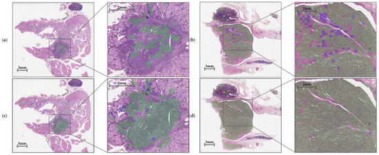 In this experiment, our cascaded architecture, comprising trained CNN and CRNN, recognizes tumors and finally predicts TERT mutation status according to the tile-based WSI input. The model identifies tumor areas at a downsampling level value 2 (¼ downscale) with a patch size of 256 × 256 and then adjusts the predicted patches to level value 0 (original scale) with a size of 1024 × 1024. The higher-resolution patch was cropped to 24 patches with a size of 256 × 256, which were delivered simultaneously to the CRNN model to predict TERT mutation status. As shown in Figure 9, the CNN model determined whether each patch belonged to non-tumor or tumor areas. Once classified as a tumor, patches correctly predicted as TERT positive were marked with a green color, but those predicted incorrectly were indicated with a purple color.