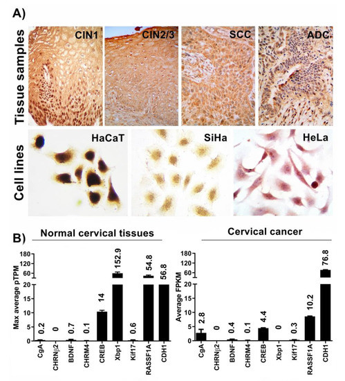 Expression of REST (RE1-Silencing Transcription factor) in tissues and cell lines. (A) REST immunostaining in tissue samples of premalignant lesions, cervical cancer, and cell lines. CIN: cervical intraepithelial neoplasia; SCC: squamous cell carcinoma; and ADC: adenocarcinoma. (B) Predicted mRNA levels of neuronal genes in normal cervical tissue (left graphic) and cervical cancer samples (right graphic), generated by the Genotype-Tissue Expression (GTEx) project from human tissues; TPM: transcripts per million; FPKM: fragments per kilobase of exon per million reads. CgA: chromogranin A; CHRNβ2: cholinergic receptor nicotinic beta 2 subunit; BDNF: brain-derived neurotrophic factor; CHRM4: cholinergic receptor muscarinic 4; CREB: CAMP responsive element binding protein 1; Xbp1: X-box binding protein 1; Kif17: kinesin-like protein; CDH1: cadherin 1; and RASSF1: Ras association domain family 1.