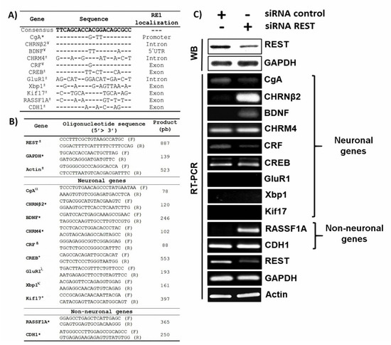 Localization of RE1 (Restrictive element 1) sequences and effect of REST silencing on its target genes in HeLa cells. (A) RE1 sequences in the monitored genes. * and ¥ correspond to RE1 sequences previously reported by Kashiwagi et al. (2012) [18] and Schoenherr et al. (1996) [19], respectively, while ± corresponds to RE1 sequences reported in this study. (B) List of oligonucleotides used in this study [20,21,22,23,24]. F: Forward; R: Reverse. * Oligonucleotides used in this study; Oligonucleotides reported by: ± Ortuño-Pineda et al., [3]; α Chteinberg et al., 2018 [20]; β Janitzky et al., 2014 [21]; + Bo et al., 2014 [22]; λ Challenor et al., 2015 [23]; κ Wang et al., 2015 [24] (C) REST silencing and RT–PCR of the REST targets. The upper panel labeled WB corresponds to Western blot for REST, and the lower panel corresponds to RT–PCR for REST target genes. CRF: corticotropin-releasing factor; GluR1: ionotropic glutamate receptor.