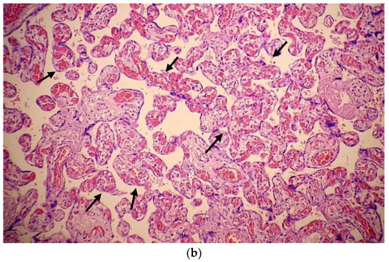 (a): Placenta with diffuse chorioangiosis (×4); (b): Important vascular changes of the terminal chorionic villi consistent with chorioangiosis (black arrows) (×10).