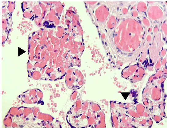 Detailed image showing >10 capillaries per terminal chorionic villus (black arrowhead) (20×).