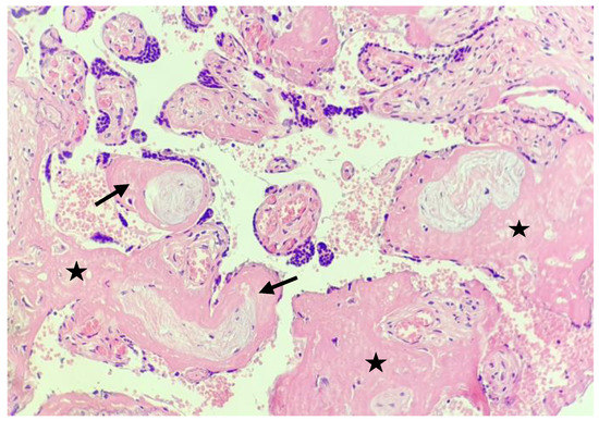 Detailed image showing marked peri-villous (star) and intra-villous (black arrow) fibrin deposition with dystrophy and ischaemic changes 󠅢(20×).