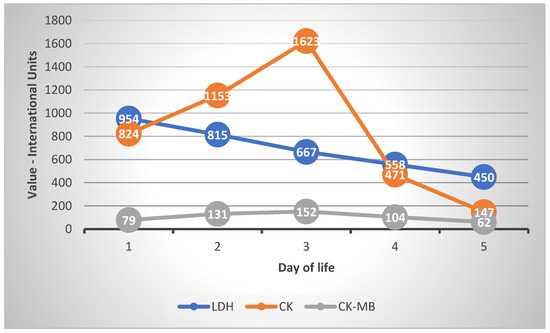 We used blood lactate dehydrogenase (LDH) [11,12], creatine-kinase (CK) and creatine-kinase muscle-brain (CK-MB) [13] as markers of tissue hypoxia. LDH was increased during the first 3 days of life, but the values were under the cut-off value for risk of severe prognosis (1054 U/L) [12]. The values of LDH decreased within normal limits from Day 4 of life onward. CK and CK-MB increased during the first 3 days and then decreased to normal on Day 5 of life. Two transfusions of fresh frozen plasma were administered on Days 1 and 2 of life.
