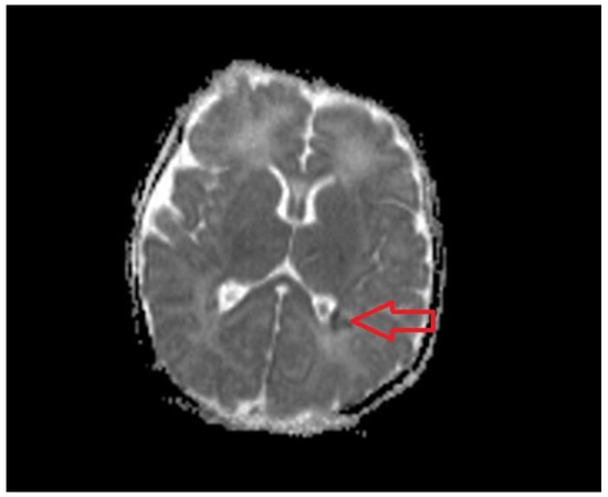 The lesion present in this case was identified in the MRI on Day 5 and consisted of punctate white matter injury in the periventricular area, also called a “focal/multifocal injury pattern” [43]. This pattern has been described in cases of milder asphyxia and circumstances leading to hypoxia without significant acidosis [44]. The lesion has a good prognostic value, as the patients with this lesion have either a normal outcome or milder and nonspecific deficits [17].