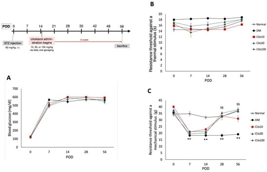 Experimental timetable and effects of cilostazol treatments on (A) blood glucose levels and hind paw withdrawal thresholds against (B) thermal and (C) mechanical stimuli. Scatter points represent SEM; error bars represent SE. ** Indicates significant differences at p < 0.001 compared to baseline values, and §§ at p < 0.001 compared to the corresponding DM value, standard single factor analysis of variance (ANOVA). POD, post-operation day; Cilo10, 10 mg/kg cilostazol; Cilo30, 30 mg/kg cilostazol; Cilo100, 100 mg/kg cilostazol.