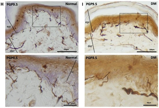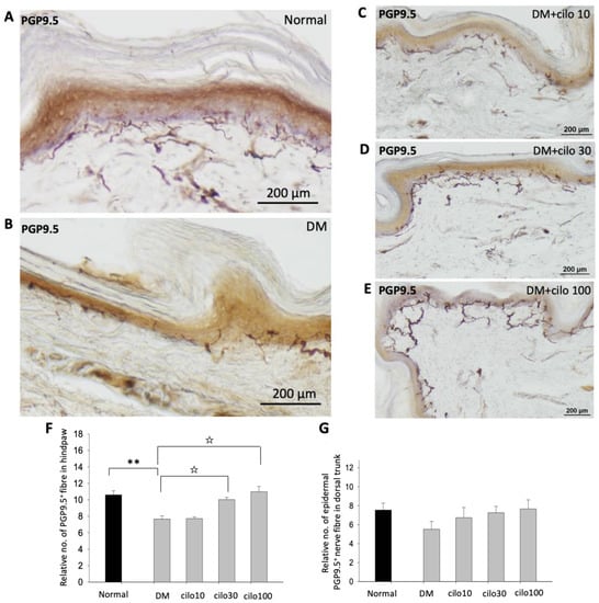 PGP-9.5, also known as neuronal cytoplasmic protein 9.5, is a sensitive and common marker of nerve sheaths [23,24]. Significantly lower numbers of PGP9.5-immunolabeled nerve endings were observed in the epidermal layer of the hind paws of diabetic rats than those of the control group (Figure 2A,B). In the low-dose (10 mg/kg) cilostazol treatment group, the number of PGP9.5-positive penetrating nerve fibers did not persevere (Figure 2C,F). However, the number of PGP9.5-positive nerve fibers in the epidermal layers was reversed in DM rats administered with 30 or 100 mg/kg cilostazol (Figure 2D–F). In contrast, there were no significant differences in the number of PGP9.5-positive penetrating nerves in the epidermal layers of back trunk skin between control and diabetic rats (Figure 2G). In addition to the reduced number of PGP9.5-positive epidermal sensory nerve fibers, more swollen or shorter PGP9.5-positive nerve fibers were also observed in the epidermal layers of the hind paws of the foot pads of DM rats compared to control rats (Figure 2I,H).