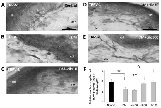 TRPV-1, a nonselective cation channel, is normally expressed on the peripheral and central terminals of small-diameter sensory neurons and is frequently studied in conjunction with CGRP with regard to pain [28,29,30]. In the control rats, TRPV-1 expressions were largely observed in the dermis, close to the epidermal layer (Figure 5A). The hind paws of DM rats showed reduced numbers of detectable TRPV-1-positive nerve fibers (Figure 5B). Among the cilostazol-treated DM rats, the 30 and 100 mg/kg treatment groups showed relatively preserved numbers of TRPV-1 positive nerve fibers in the paw dermis (Figure 5C–F).