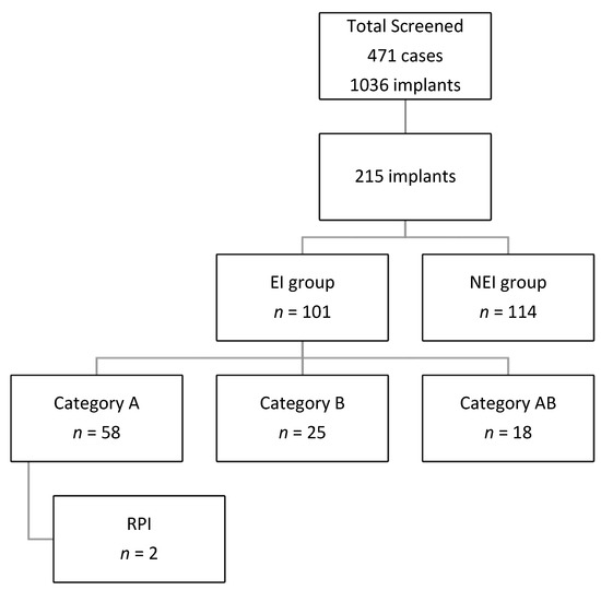 A total of 24 cases showed RL around the implant (11.2%), 22 among EI groups (17 in category A and five in category AB), and 2 among the NEI group.