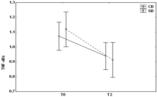 Changes in TNF-alpha (mean ± SD) levels at different times (T0, baseline; T2, after 2 months of the treatment) in patients with conventional brackets (CB) and self-ligating brackets (SB).