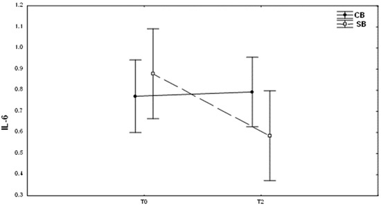 Changes in IL-6 (mean ± SD) levels at different times (T0, baseline; T2, after 2 months of the treatment) in patients with conventional brackets (CB) and self-ligating brackets (SB).