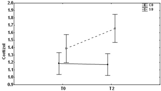 Changes in cortisol (mean ± SD) levels at different times (T0, baseline; T2, after 2 months of the treatment) in patients with conventional brackets (CB) and self-ligating brackets (SB).