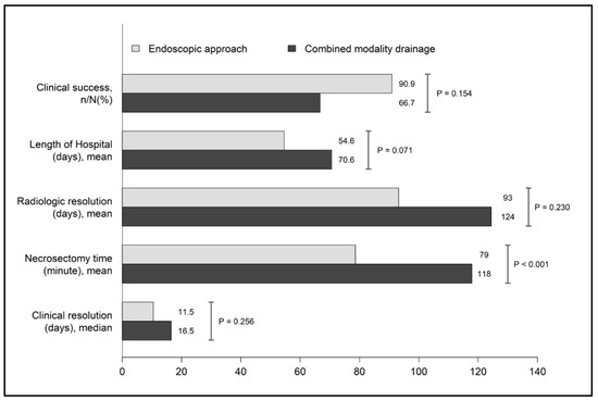 Clinical outcomes between the endoscopic approach and combined modality drainage.