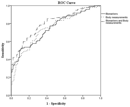 | Biomarkers score = (−1.9727) + 0.3669 × Leptin + (−0.0218) × Adiponectin + 0.1661 × IL6 Body measurements score = 13.0994 + (−0.2735) × CW + 0.1125 × WC + (−0.2967) × RAL Biomarkers and body measurements score = (15.3447) + 0.4082 × Leptin + (−0.0239) × Adiponectin + 0.2282 × IL6 + (−0.4781) × CW + 0.14 × WC + (−0.3034) × RAL | ||||