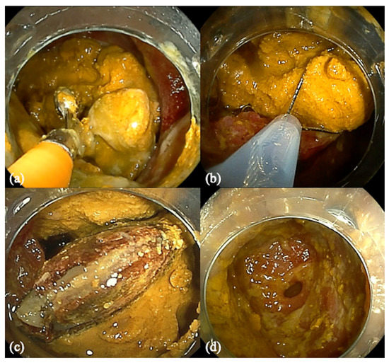 - Kim, H.J.; Moon, J.H.; Choi, H.J.; Koo, H.C.; Park, S.J.; Cheon, Y.K.; Cho, Y.D.; Lee, M.S.; Shin, C.S. Endoscopic removal of an enterolith causing afferent loop syndrome using electrolithotripsy. Dig. Endosc. 2010, 22, 220–222. [Google Scholar] [CrossRef]