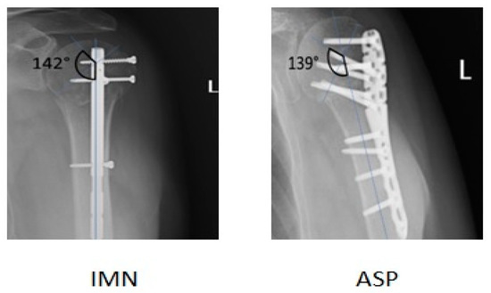 Results were assessed at 6 weeks, 3 months and 6 months postsurgery during follow-up visits. At each follow-up visit, radiographs were obtained in standard AP and Y views. Radiological evaluation was based on bone union, implant placement and the humeral neck–shaft angle (NSA) [23] (Figure 1). Limb function was assessed and assigned to an appropriate group according to the QuickDash (QuickDASH uses 11 items to measure physical function and symptoms in people with any or multiple musculoskeletal disorders of the upper limb) and Constant–Murley scores (a summative scale that provides a global score based on weighted measures of physical impairments in range-of-motion (ROM) and strength along with patient-reported pain and activity limitation (Constant and Murley, 1987)) [24,25,26].