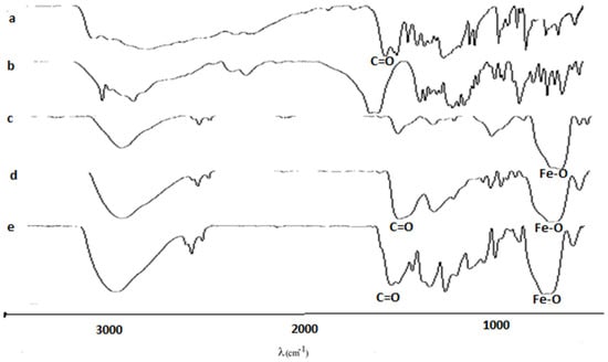 Fourier transformed infrared (FTIR) spectra of magnetic nanocomposites (a) protocatechuic acid (b) citric acid (c) magnetic nanoparticles (d) magnetic nanoparticles covered with citric acid (e) magnetic nanoparticles covered with citric acid and loaded with protocatechuic acid.
