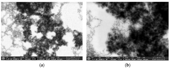 The STEM measurements of MNPs showed spherical particles of 7–10 nm with a tendency to agglomerate. For MNP-CA, the STEM images showed the CA coating around the bare MNPs. The difference between DLS measurements and the TEM ones consisted of the fact that in TEM, the solvent evaporated slowly, but in DLS the nanoparticles moved in an aqueous medium, resulting in bigger structures (Figure 2a,b).