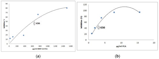 For MNP-CA-PCA, the DPPH tests indicated an IC50 value of 600 μg/mL. This confirmed good antioxidant activity. Not only did the magnetic core of MNPs not decrease the antioxidant activity of simple PCA but also had an overall contribution in the final antioxidant activity of the MNP-CA-PCA samples (Figure 3a,b).