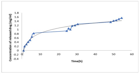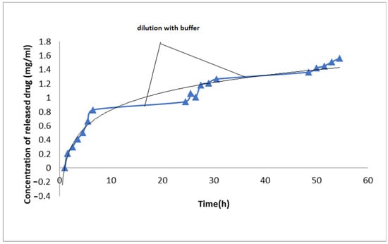 where: v = volume of the release media taken out every time; V = volume measured by UV-VIS; Cf’ = concentration of the released drug and Cf = concentration in volume V at specific intervals.