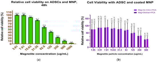 (a) ADSC viability with increasing concentrations of as-prepared MNP; (b) ADSC viability with MNP coated with dextran and protocatechuic acid D-PCA and citric acid and protocatechuic acid CA-PCA in 63 mg/mL and 125 mg/mL concentrations added in the culture, respectively.
