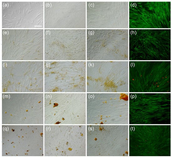 LIVE/DEAD qualitative evaluation of ADSC viability in the presence of MNP. (a–d) ADSC from day 0 to day 7 (in that order), bright field (BF) d 10×. (e) LIVE/DEAD staining at day 7 after LIVE/DEAD fluorescence, 10×. (f–h) ADSC-MNP-CA-PCA 63 μg/mL at days 3, 5 and 7, respectively BF 10×; (i) ADSC-MNP-CA-PCA LIVE/DEAD 7 day fluorescence. (j–l) ADSC-MNPs of 125 μg/mL at days 3, 5 and 7 BF 10×; (m) ADSC-MNP LIVE/DEAD day 7 fluorescence at BF 10×. (n–p) ADSC-MNP-D-PCA 63 μg/mL, BF 10×; (q) ADSC-MNP-D-PCA 7 day LIVE/DEAD fluorescence BF 10×; (r,s) ADSC-MNP-D-PCA 125 μg/mL, BF 10×; (t) ADSC-MNP-D-PCA 125 μg LIVE/DEAD, fluorescence, BF 10×; ADSC = cells non exposed to magnetic nanoparticles; ADSC-MNP = cells exposed to as-prepared magnetic nanoparticles; ADSC-MNP-CA-PCA = ADSC exposed to magnetic nanoparticles coated with citric acid and functionalized with protocatechuic acid; ADSC-MNP-D-PCA = ADSC exposed to magnetic nanoparticles coated with dextran and functionalized with protocatechuic acid.