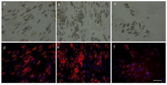 Adipogenic differentiation of ADSCs exposed and not exposed to magnetic nanoparticles: (a) ADSC-MNP-CA-PCA 63 μg/mL adipogenic differentiation after 10 days, BF 20×.; (b) ADSC-MNP-CA-PCA 125 μg/mL; (c) ADSCs not exposed to MNP ((a–c) bright field); (d) ADSC-MNP-CA-PCA 63 μg/mL fluorescence (Adipored). The lipids are reddish-orange and the nuclei are blue (Hoechst); (e) ADSC-MNP-CA-PCA 125 μg/mL fluorescence (AdipoRed); (f) ADSCs not exposed to MNP (d–f) fluorescence (Adipored). The scale bar is 100 μm. Representative results are from one donor.