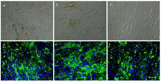 Osteogenic differentiation of ADSCs exposed and not exposed to MNP after 19 days in culture: (a) ADSC-MNP-CA-PCA 63 μg/mL osteogenic differentiation after 19 days, BF 20×; (b) ADSC-MNP-CA-PCA 125 μg/mL; (c) ADSCs not exposed to MNP ((a–c) bright field); (d) ADSC-MNP-CA-PCA 63 μg/mL fluorescence (OsteoImage®). The deposited mineralized extracellular matrix is green and the nuclei are blue (Hoechst); (e) ADSC-MNP-CA-PCA 125 μg/mL fluorescence OsteoImage® (f) ADSCs not exposed to MNP (d–f) fluorescence OsteoImage® 20×. The scale bar is 100 μm. Representative results are from one donor; ADSC-MNP = cells exposed to non-coated magnetic nanoparticles; ADSC-MNP-CA-PCA = ADSC exposed to magnetic nanoparticles coated with citric acid and functionalized with protocatechuic acid; ADSC-MNP-D-PCA = ADSC exposed to magnetic nanoparticles coated with dextran and functionalized with protocatechuic acid.