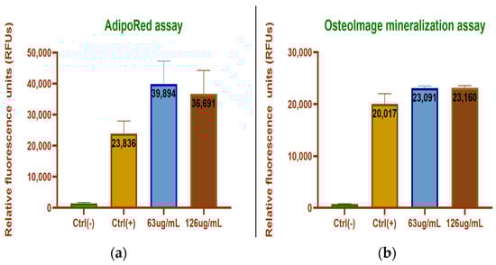 Quantitative differentiation assay. (a) Adipogenic differentiation of ADSCs exposed and not exposed to magnetic nanoparticles MNP-CA-PCA; (b) osteogenic differentiation of ADSCs exposed and not exposed to MNP-CA-PCA.