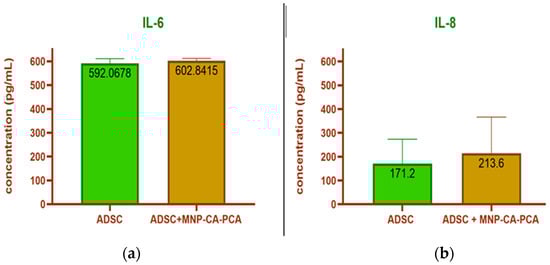 The alteration of the anti-inflammatory profile of ADSCs in the presence of MNPs was investigated by measuring the level of interleukins IL-6 and IL-8 released in serum-free culture media using the ELISA technique. We found that after 11 days in culture, ADSCs and ADSC-MNP-AC-PCA release had strikingly comparable levels of IL-6, averaging 590/609 pg/m, while non-significant increases of IL-8 could be detected in ADSC-MNP-AC-PCA (averaging 171/2 compared with 213/6 pg/m (Figure 11a,b).