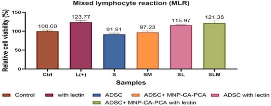 For MLR, we used the modified protocol by Herzig et al. []. First, 5 mL complete blood was collected in a vacutainer containing citrate as anticoagulant. Then, 15 mL Pancoll was placed in a 50 mL tube; 5 mL of blood was mixed with 5 mL PBS and allowed to settle, followed by centrifugation at 900 g for 30 min at 18 °C without the brake. PBMCs were extracted and resuspended, diluted with CCM and counted. The number of replicates for each of the 16 conditions was 3 with 6 × 10 × 5 cells per sample (sample set = 18; there were 16 treated and two controls (one positive and one negative) for lectin (Figure S1, Supplementary Materials). The sample set included conditioned media (CM) from ADSCs with or without MNP-CA-PCA at a 50% concentration (ADSC 50% (50 µL/100 µL) 50 µL concentrated CM and 50 µL medium = 100 µL) and at a 25% concentration (ADSC 25% (25 µL/100 µL) 25 uL concentrated CM and 75 µL medium = 100 µL) in the presence and absence of lectin; 96-well plates were used for this assay. Then, 100 µL per sample was left to incubate for 72 h at 37 °C. PBMC viability/proliferation was determined using 100 μL celltiter-Glo/well; data were processed in GraphPad.
