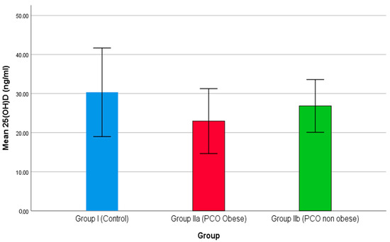 In this cross-sectional study, 200 females attending the Islamic University Medical Centre were grouped into group I, including 100 healthy females; group IIa 70, including overweight or obese females with PCOS; and group IIb, including 30 non-obese females with PCOS. Figure 1 demonstrates the comparison of mean 25(OH)D levels among the three groups of participants. As the results show in Figure 1, group II (obese females with PCOS) reported a minimum level of serum means of 25(OH)D ng/mL compared to the other two groups i.e., IIb (non-obese with PCOS) and control (group I). A higher level of mean 25(OH)D ng/mL was reported in the control group (group I). Previously, Lin and Wu (2015) demonstrated the role of vitamin D in polycystic ovary syndrome [65]. Thomson et al. (2012) determined the level of 25(OH)D in healthy and PCOS patients. A reduced level, i.e., less than 20 ng/mL of 25(OH)D triggers a higher prevalence of PCOS cases (67–85%) [66]. Additionally, a low level of 25(OH)D is also involved with IR in females with PCOS [67,68].