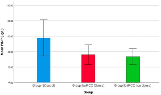 Procollagen type I N propeptide (PINP) serum levels were compared among the three groups and are demonstrated in Figure 3. As the results show in Figure 3, both groups IIa and IIb reported a declining level of PINP. In the study, the PINP level was higher in the control group than the PCOS groups, while group IIa (obese females with PCOS) showed significantly higher levels than group IIb (non-obese females with PCOS). PINP is the marker for bone formation, and as the results show in Figure 3, both groups IIa and IIb reported a sharp decline in serum level; hence, bone formation remains hampered. Lingaiah et al. (2017), in a multicenter study, demonstrated that a decreased level of PINP is associated with PCOS [70]. Additionally, the PINP level is also associated with 25(OH)D level and with risk factors of hyperandrogenism, hyperinsulinemia, and obesity [71].
