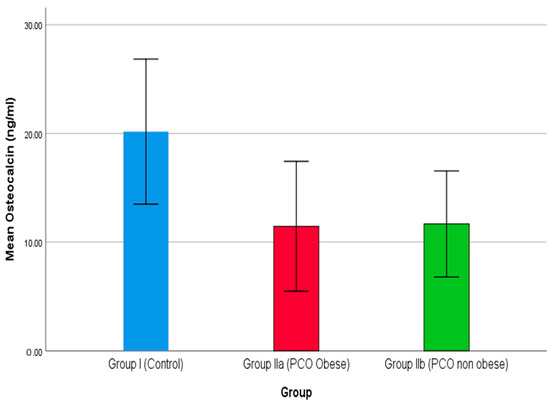 PCOS poses a negative impact on bone health, where obesity is a crucial risk factor associated with 25(OH)D [72]. PTH indirectly enhances vitamin D via an increased level of Ca+2. Additionally, an increase in PTH level also enhances the PINP level [73]. In the present study, a declining level of PINP reported in the two groups, i.e., IIa and IIb, indicates a higher risk of PCOS. Similarly, comparison of osteocalcin among the three groups is shown in Figure 4, where groups IIa and IIb demonstrate a declining level of osteocalcin compared to group I (control). Additionally, group IIa reported the lowest level of osteocalcin, which demonstrates that obesity is a key cause of PCOS. Serum osteocalcin is a key biomarker for osteoporosis. On the contrary, Singh et al. (2015) reported a higher level of serum osteocalcin in a case-control study where patients showed a sharp rise in osteocalcin level over the control [74]. Vs et al. (2013) report a negative correlation between bone mineral density and osteocalcin level [75].