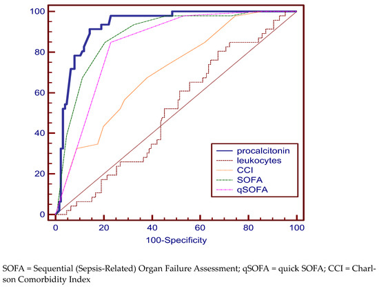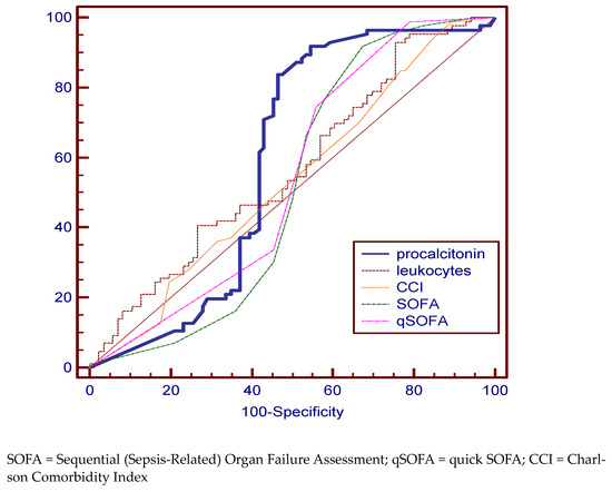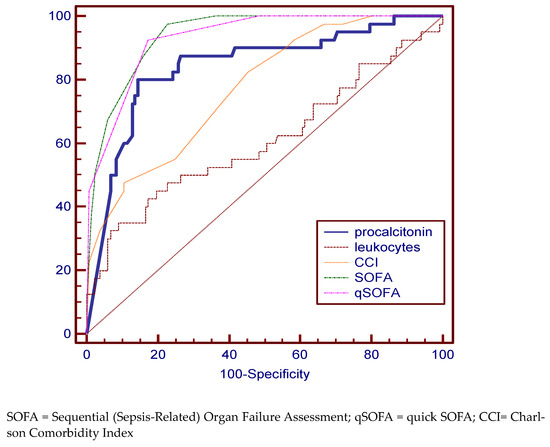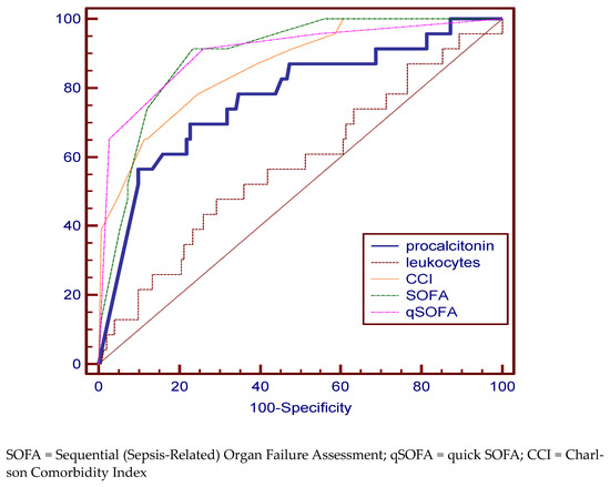 Comparing the ROC curves for the variables of interest in the deceased group, a very good specificity and sensitivity was identified in predicting the risk of death for PCT (69.57%, 77.33%), SOFA (91.33%, 76.82%), qSOFA (91.30%, 74.17%) scores, and CCI (65.22%, 88.74%). The best AUC value were 90.3% for qSOFA (Figure 1, Table 2).