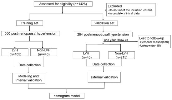 1486 postmenopausal hypertensive women aged between 49 and 68 years were recruited from Lanzhou University Second Hospital December 2017 to December 2019. Inclusion criteria were as follows: (1) the diagnosis of hypertension was determined by experienced physicians in accordance with 2010 Chinese guidelines for the management of hypertension diagnostic criteria for hypertension (systolic blood pressure ≥ 140 mmHg and/or diastolic blood pressure ≥ 90 mmHg) []; (2) menopause, which refers to the physiological phenomenon of complete ovarian failure and permanent cessation of menstruation in women with age (elevated blood pressure (BP) in women after one year of physical menopause is called postmenopausal hypertension) []; and (3) studies included participants with complete clinical data. Exclusion criteria included: (1) patients who were diagnosed with arterial hypertension before menopause; (2) heart valve disease, coronary artery disease, diabetes mellitus, hyperuricemia, secondary hypertension and heart valve disease, coronary artery disease and other cardiopathies; (2) ovarian hysterectomy; and (3) hepatic and renal dysfunction. After screening, 846 participants were allocated in a 2:1 ratio to either the training set (n = 550) or validation set (n = 284). Participants in the validation set were followed up for one year.