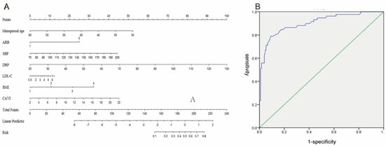Modeling and external validation. (A): the nomogram of the risk model of left ventricular hypertrophy in patients with postmenopausal hypertension; (B): the ROC curve (external validation of LVH-predictive nomogram). ARB: angiotensin receptor blocker; BMI: body mass index; CAVI: cardio-ankle vascular index; DBP: diastolic blood pressure; LDL-C: low-density lipoprotein cholesterol; ROC curve: receiver operating characteristic curve; SBP: systolic blood pressure.