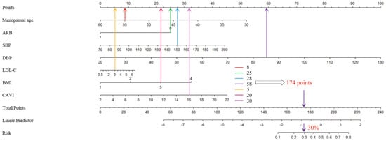 Based on the above analysis of independent predictors and professional knowledge, a nomogram was constructed to visualize the logistic regression model (Figure 2A). For example, a 55-year-old menopausal patient with hypertension (8 points) who did not take ARB drugs (25 points) had an early morning SBP of 150 mmHg (28 points), DBP of 85 mmHg (58 points), LDL-C of 3 mmol/L (5 points), BMI greater than 24 kg/m2 (20 points), CAVI of 16 (30 points), had a total score of 174 points; the predicted risk value using the nomogram was about 30% (Figure 3).