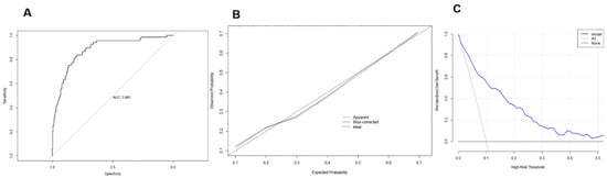 The C-index was used to evaluate the discrimination degree of the nomogram, namely concordance index (C-index) = 0.881 (95% CI 0.837–0.924), showing its good accuracy (area under the receiver operating characteristic curve (AUC) = C-index = 0.881) (Figure 4A). After the internal verification of the nomogram model by the method of Bootstrap repeated 1000 times sampling, a high-quality calibration curve of the prediction model was obtained, indicating that there was a good consistency between the prediction model and the actual observed results (Figure 4B).