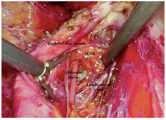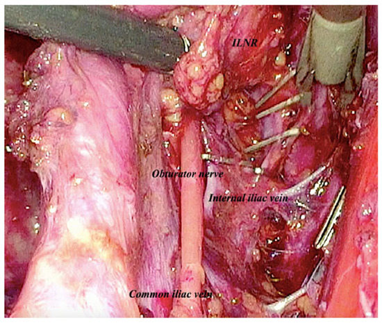 Laparoscopic intraoperative image showing clips of venous vessels afferent to the internal iliac vein, and of the obturator vessels near to the ILNR.