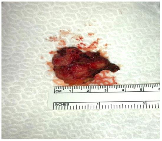 Straight-stick laparoscopy successfully managed the entire intervention, and no intra-operative complications occurred. The whole operating time was 125 min. The estimated blood loss was 90 mL. The post-operative course was uneventful, and the patient was discharged three days after the procedure. Histological examination confirmed the serous ovarian cancer intranodal recurrence (Figure 6). Since the nature of the recurrence (isolated lymph-nodal), the previous maintenance therapy with PARPi, and the absence of residual tumor, we decided to do quarterly follow-up; actually, after 16 months, no recurrence was detected.