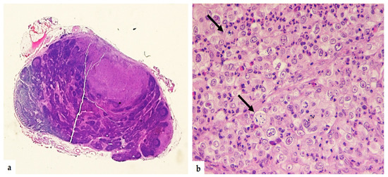 Isolated lymph node metastasis. Hematoxylin and Eosin image without magnification shows serous ovarian cancer intranodal recurrence (a). 40× Hematoxylin and Eosin shows cell clusters (arrows) within lymph node parenchyma with big nucleoli and significant nuclear atypia (b).