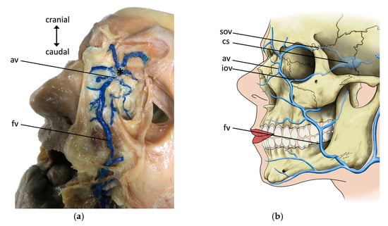 Illustration of the anastomosis (*) of the facial vein (fv) and the superior ophthalmic vein (sov). (a) Left side of a male specimen’s face. The facial vein (fv) was injected with blue latex and carefully dissected. Anastomosis via the angular vein (av) was found. (b) A schematic overview of the anastomoses between the facial vein and the superior ophthalmic vein as well as the intracranial dural sinuses. cs—cavernous sinus, and iov—inferior ophthalmic vein.